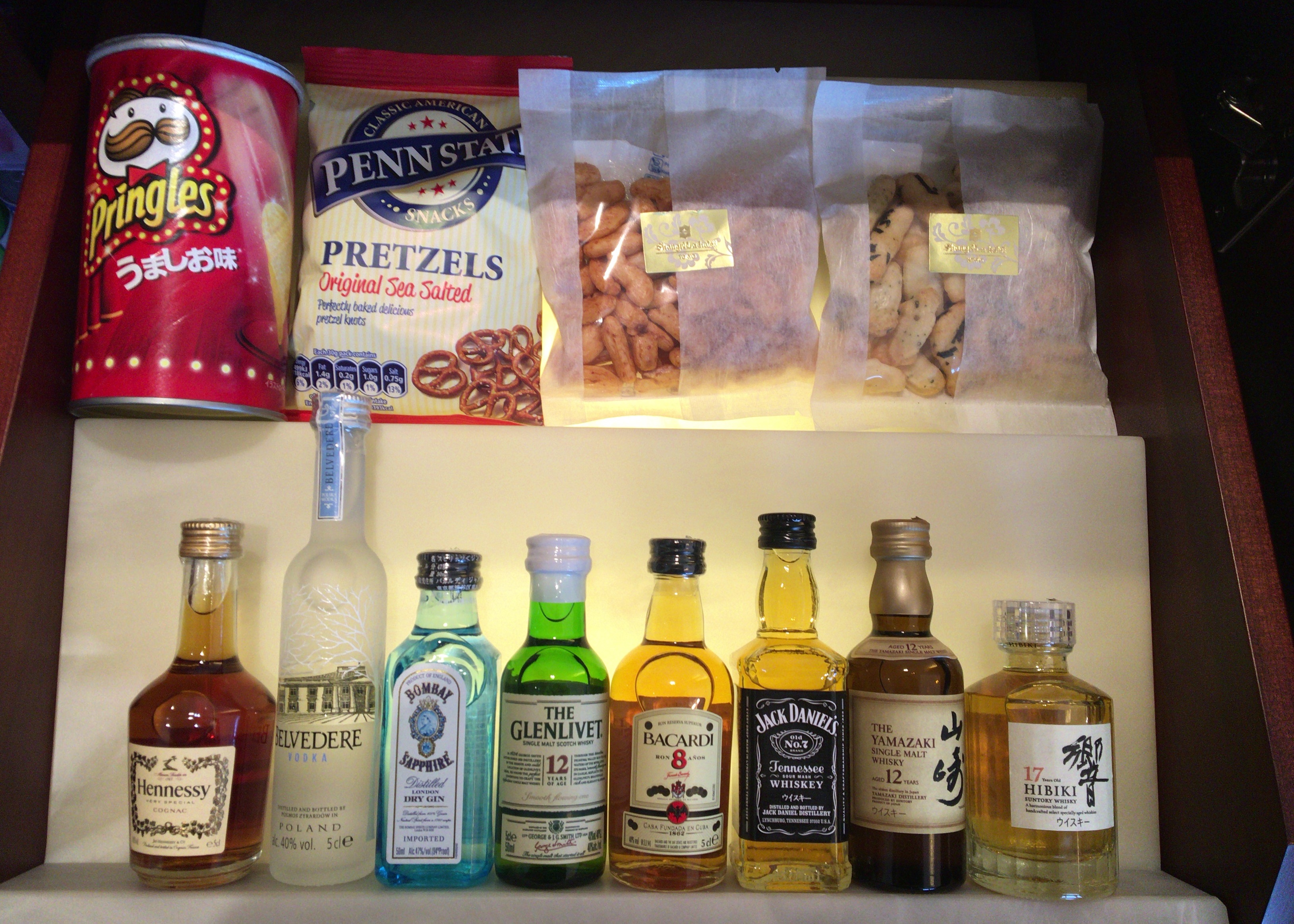 プライベートバーにはさっき紹介したお水やエスプレッソマシーンを無料で飲んだり使うことが出来るほか、お茶を飲んだり、有料になるけどお菓子を食べたり、ジュースを飲んだりすることが出来る。購入出来るものは以下のテーブルを参考にして欲しい。