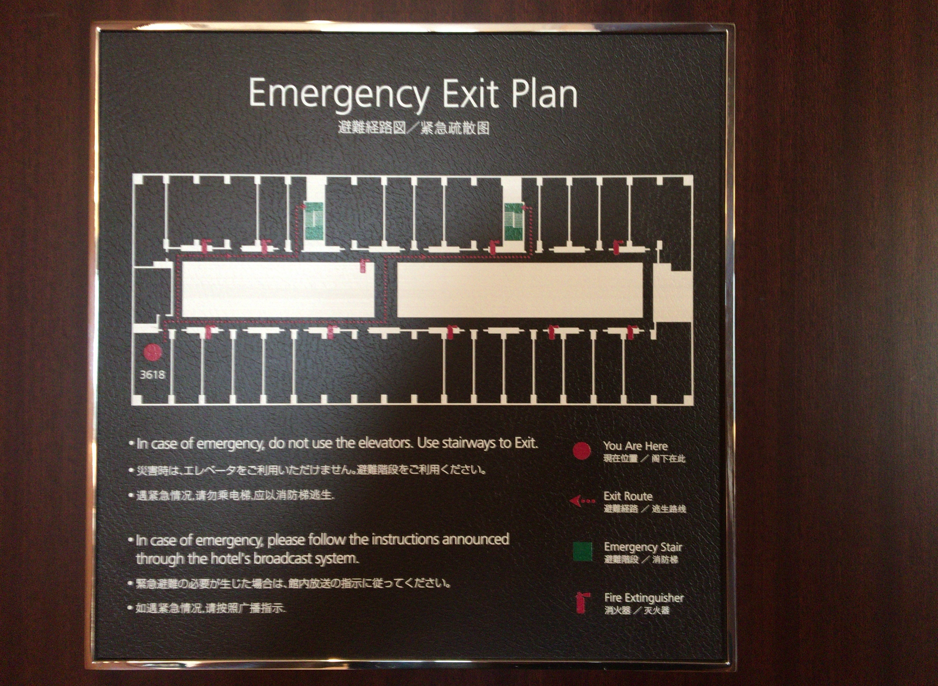 まずお部屋の中に入ったら、絶対にすべきことは避難経路の確認だね。99.9999%は安全だと言えるだろうけど、次の瞬間何が起こるのか誰にも予想出来ない。いざという時に備えて絶対に確認しておくこと。面倒だけどね。