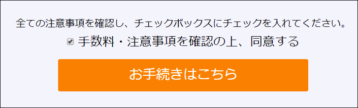 手数料を確認したらページを1番下までスクロールさせて『手数料・注意事項を確認の上、同意する』にチェックマークを入れてから『お手続きはこちら』をクリックして欲しい。