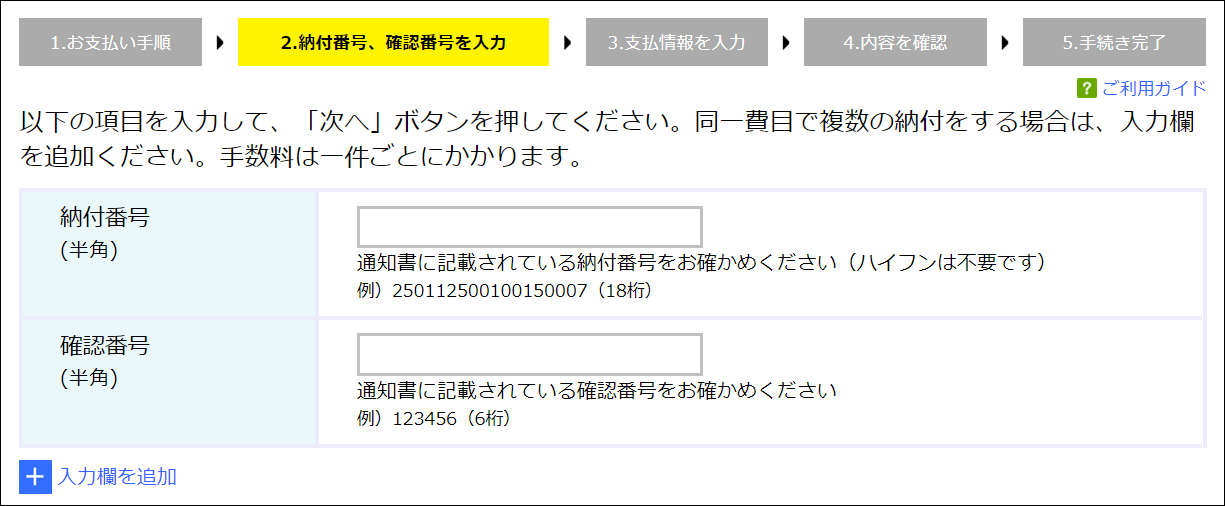 納付番号、確認番号を入力の画面に進んだら『納付番号』と『確認番号』をそれぞれ入力しよう。納付番号は18桁。確認番号は6桁。