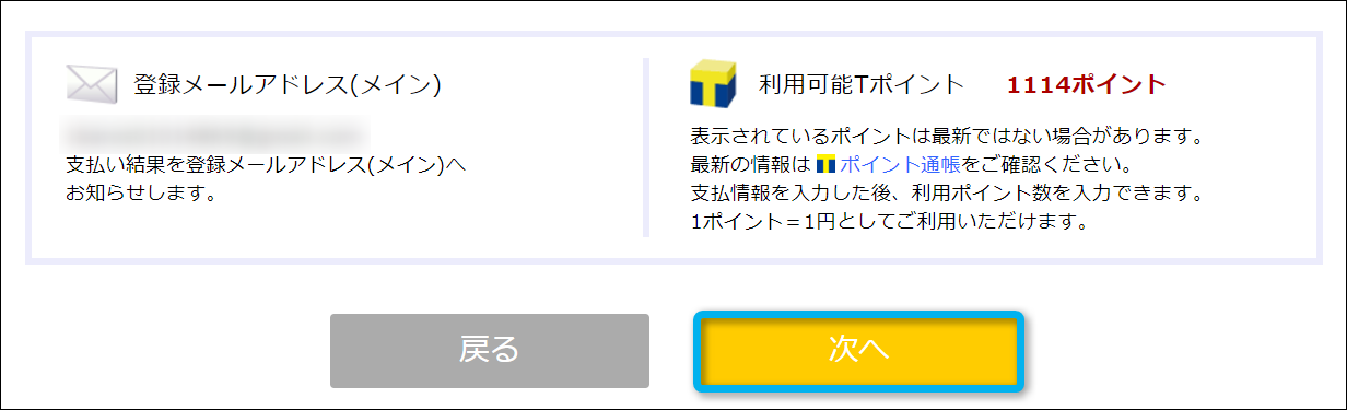 今回はTポイントを利用しないから『利用しない』を選択する。また、クレジットカードは登録済みとは別のものを使用していくから『ほかのクレジットカード』を選択するね。