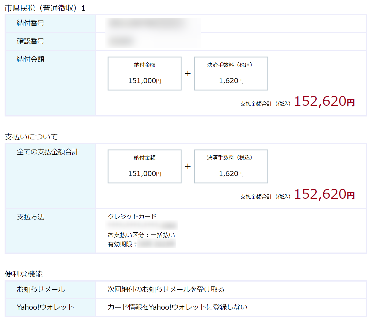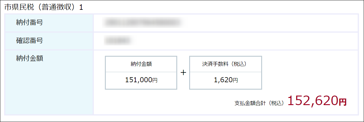 支払情報の画面に進んだら、納付金額、決済手数料(税込)に間違いがないか、住民税の通知書とよく照らし合わせて欲しい。納付金額が一致していればOK。