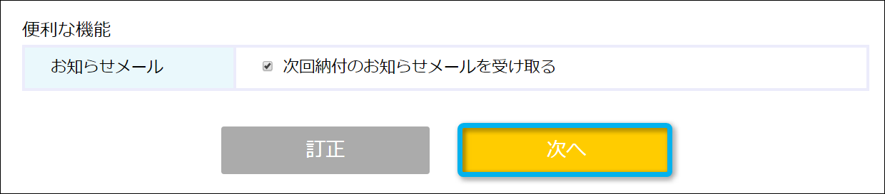 入力が完了したら、ページ下部にある『次へ』をクリックして欲しい。また、次回納付のお知らせメールを受け取りたい場合は、お知らせメールにチェックマークをいれておこう。