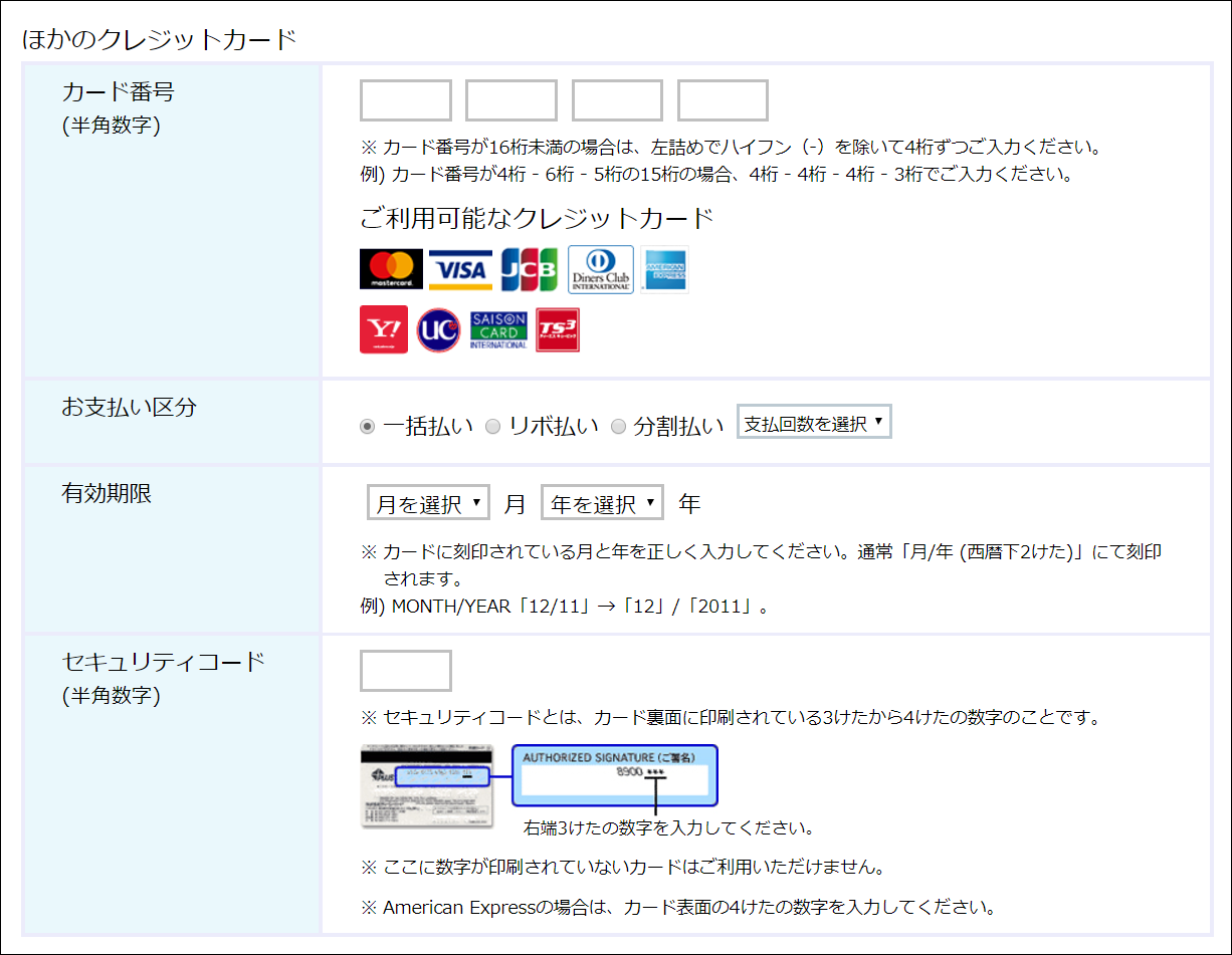 ほかのクレジットカードを選択すると、支払いについての項目の下にほかのクレジットカードのメニューが表示される。カード番号、お支払い区分、有効期限、セキュリティコードをそれぞれ入力していこう。