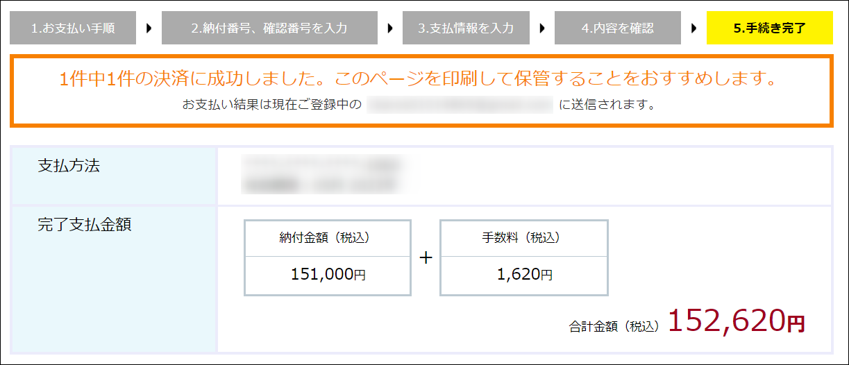 手続きが完了すると1件中1件の決済に成功しました。このページを印刷して保管することをおすすめします。というメッセージが表示される。