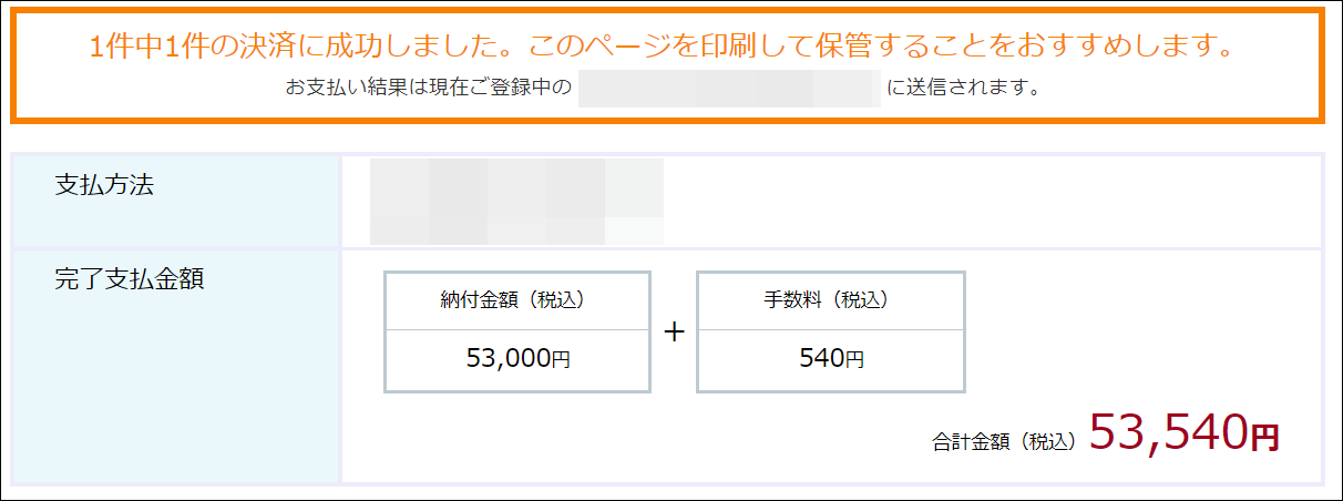 1件中1件の決済に成功しました。このページを印刷して保管することをおすすめします。というメッセージが表示されたら、正常に国民健康保険料(税)の支払が完了したことになる。