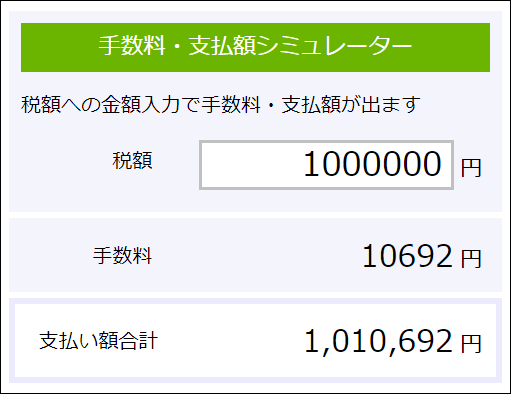 上の画像では税額を1,000,000円にしてみたけど、この場合だと10,692円も手数料が発生するみたいだね。