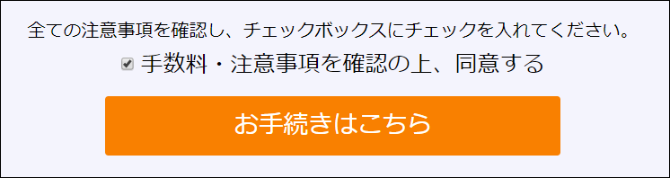 手数料、注意事項を確認したら『手数料・注意事項を確認の上、同意する』にチェックマークを入れてから『お手続きはこちら』をクリックして欲しい。