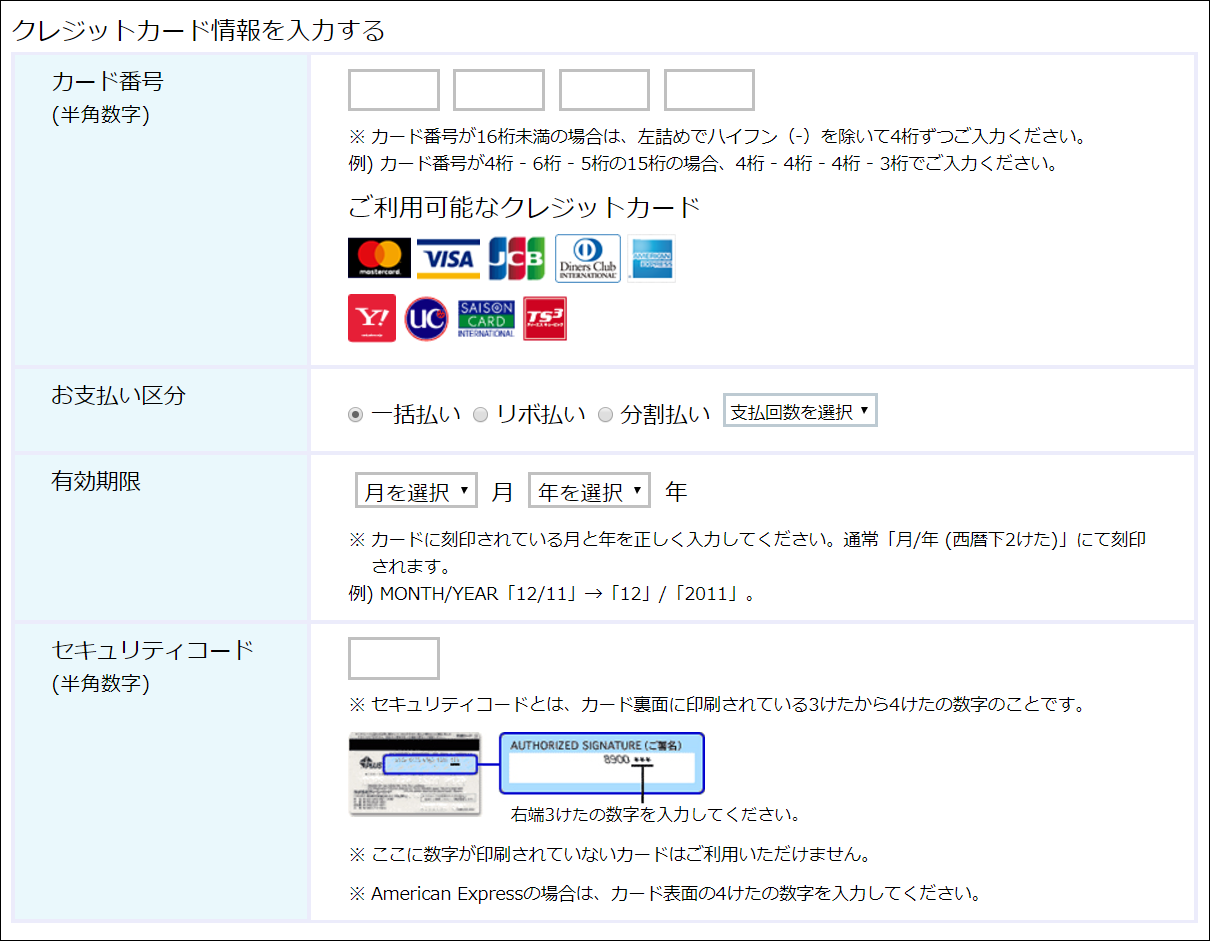 カード番号、お支払い区分(一括払い、リボ払い、分割払い(3~12回))、有効期限、セキュリティコードを全て入力しよう。