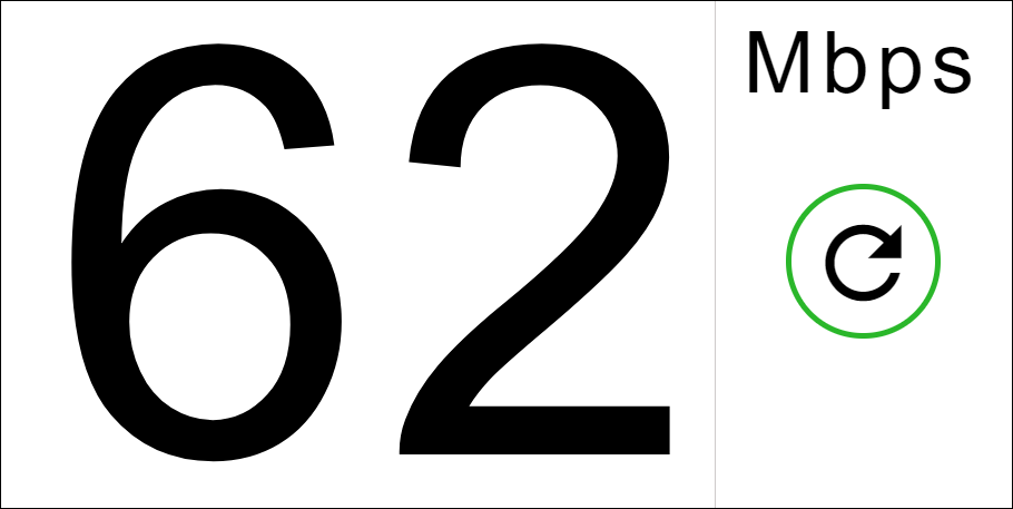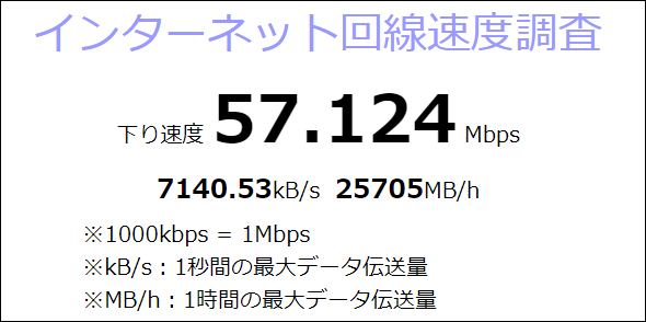 すぐに結果が表示される。今回は下り速度が57.124Mbps。上り回線は測定しくれない。