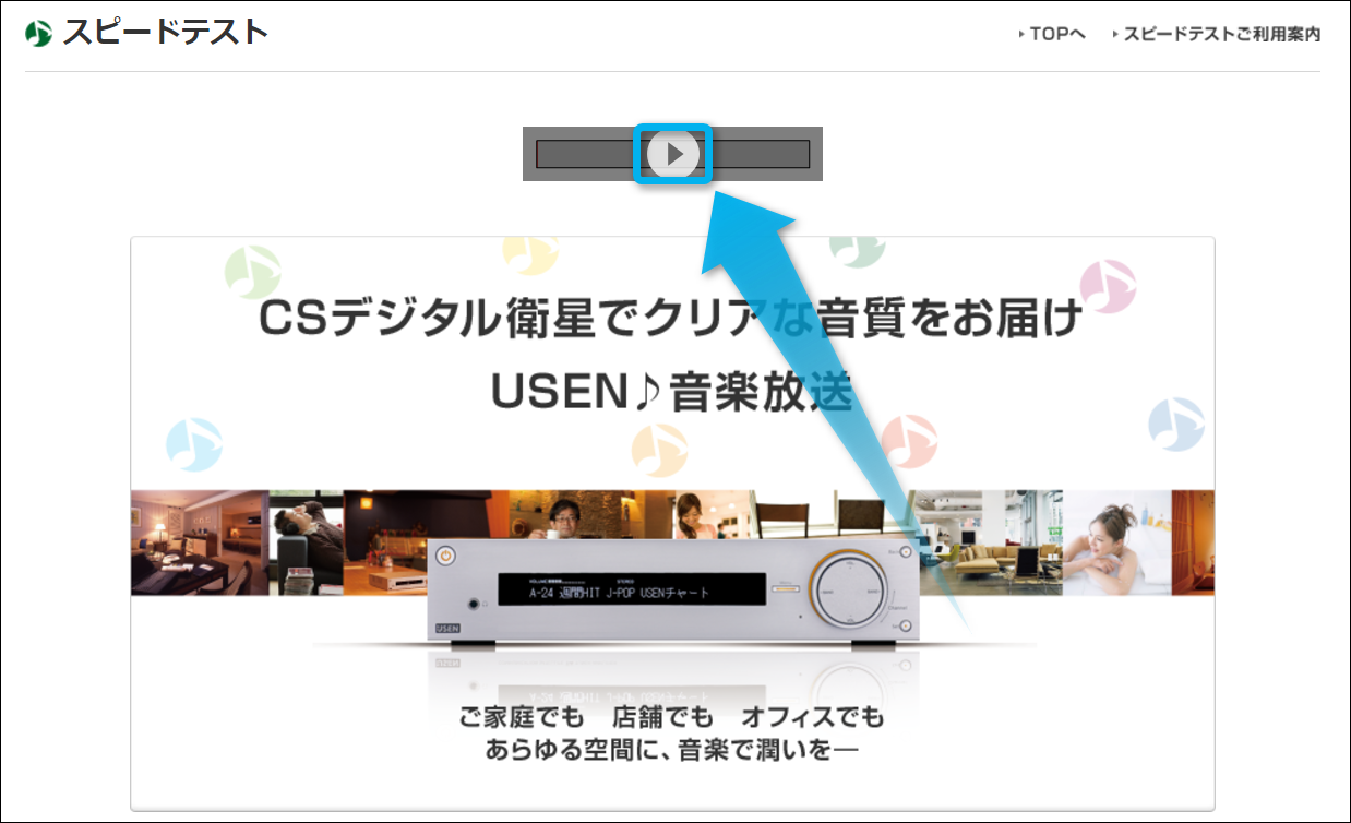 クリックしたら『再生ボタンのアイコン』をクリックしよう。後は3~15秒(回線速度が遅ければ遅いほど時間がかかる。)ほど待っていると回線速度の測定が完了する。