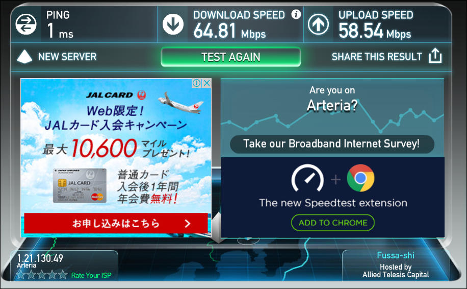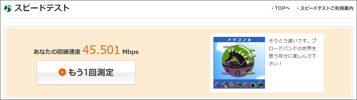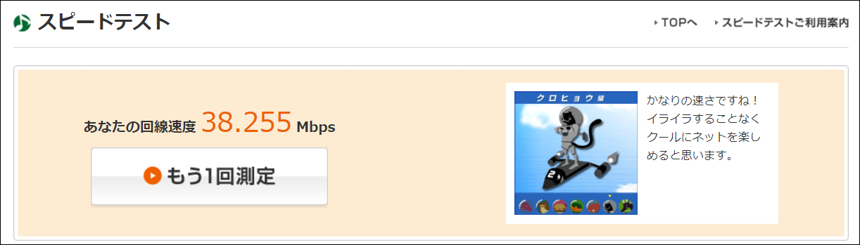 今回は38.255Mbpsということで『かなりの速さですね!イライラすることなくクールにネットを楽しめると思います。』といったメッセージが表示されたね。38もあれば回線速度が遅い!と感じることはほとんどないと思う。