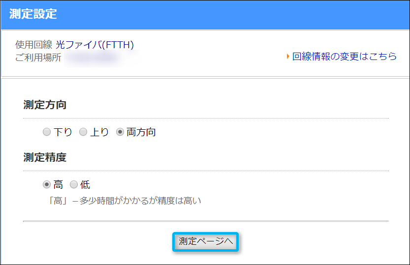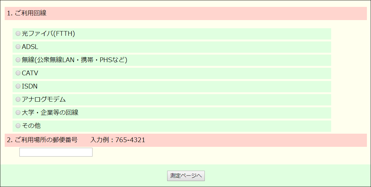 ご利用回線の選択と郵便番号の入力が求められるけど、何も弄らずに先に進むことも出来る。『測定ページへ』をクリックしよう。