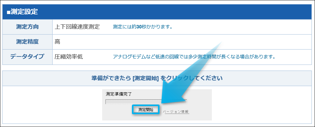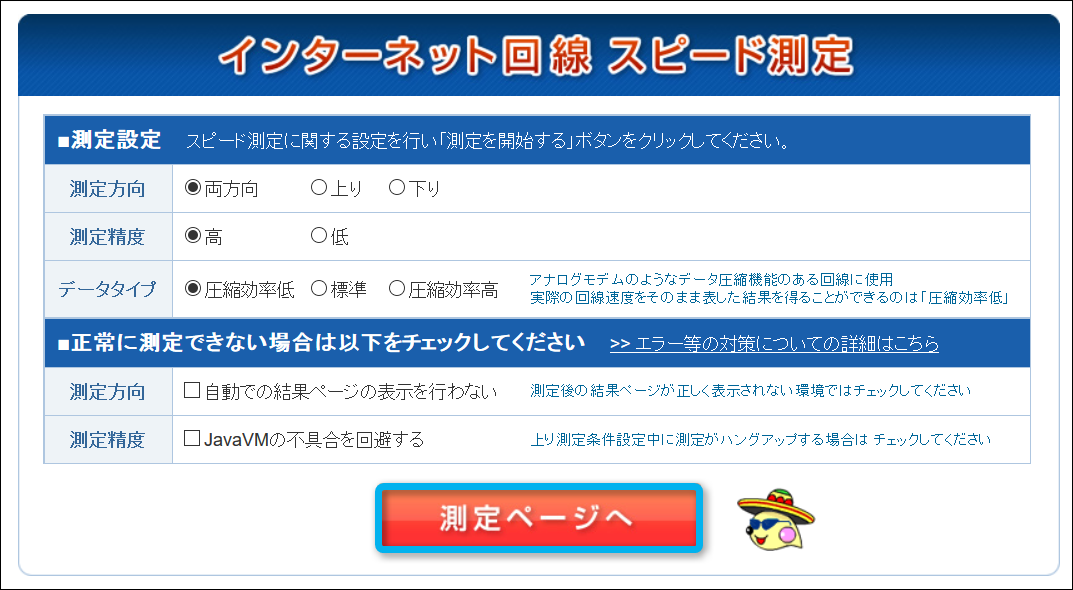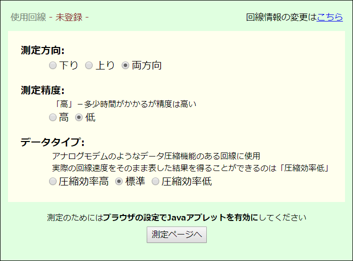 アクセスしたら、測定方向、測定精度、データタイプの項目は弄らずに『測定ページへ』をクリックして欲しい。
