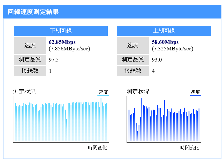 40秒ほど待機していると測定結果が表示される。今回は下り回線が62.85Mbps、上り回線が58.60Mbpsだった。