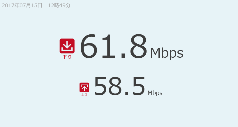 上の画像のように60とかあると本当に十分すぎるくらい。どんなに画質の良い動画を再生させても回線が原因で止まることはなくなる。上り回線の測定も出来れば最強なんだけどな。