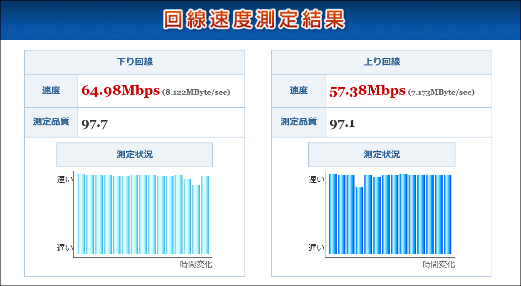 30秒ほど待っていると測定結果が表示される。今回は下り64.98Mbps、上り57.38Mbpsだった。