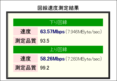 暫く待っていると測定結果が表示される。今回は下り回線が63.57Mbps、上り回線が58.26Mbps。