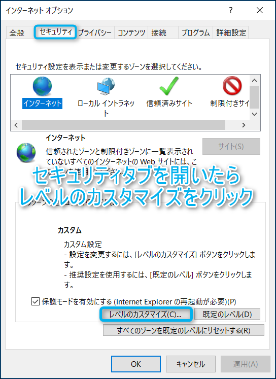 インターネットオプションの画面を開いたら『セキュリティのタブ』を開いてから『レベルのカスタマイズ』をクリックして欲しい。