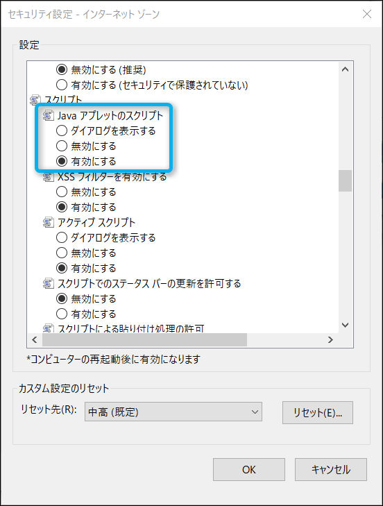 レベルのカスタマイズの画面を開いたら、真ん中より少しだけ上の辺りまでスクロールさせて『Java アプレットのスクリプト』の項目を見つけて欲しい。