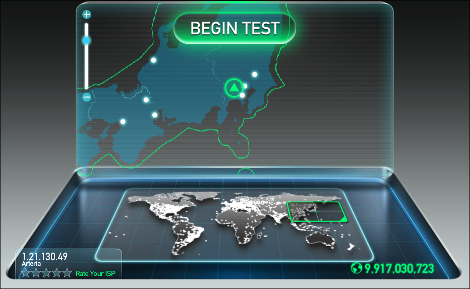 近未来的なデザインのサイト。下りと上りの両方を測定してくれる。PINGは小さければ小さいほど良いらしい。