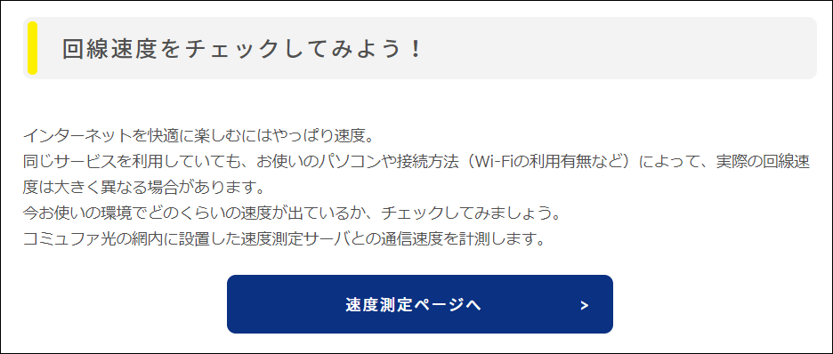 公式サイトによると、1Mbpsあればホームページ、メールなどの文字中心の利用は十分可能。10Mbpsあればインターネット、動画、ゲームは十分利用出来る速さ。30Mbps以上あれば高画質の動画もストレスなく再生出来るとのこと。