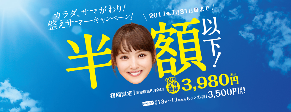 2017年7月31日まで。全身整体60分は通常価格で8,424円だけど、これが初回限定で3,980円に割引される。さらに平日の13時~17時に来店すれば3,500円。