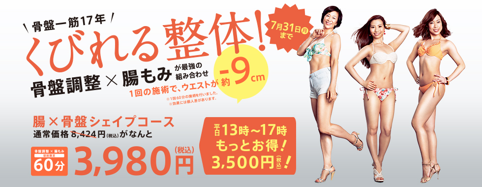 骨盤調整と腸もみの整体で8回の施術で最大ウエスト-15㎝。腸×骨盤シェイプコースは通常8,428円だけど、これが期間限定で3,980円。さらに平日の13時~17時に利用すれば3,500円ともっとお得に。