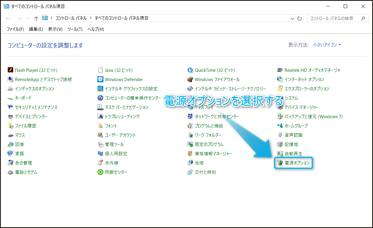コントロールパネルを開いたら『電源オプション』を選択しよう。