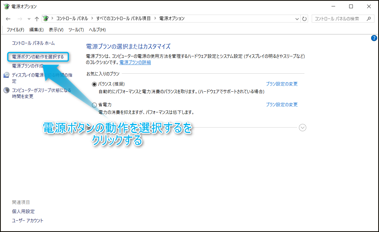 電源オプションの画面を開いたら、左のメニューから『電源ボタンの動作を選択する』をクリックしよう。