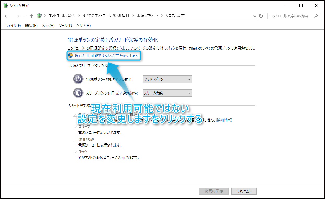 電源ボタンの定義とパスワード保護の有効化の画面を開いたら『現在利用可能ではない設定を変更します』をクリックしよう。