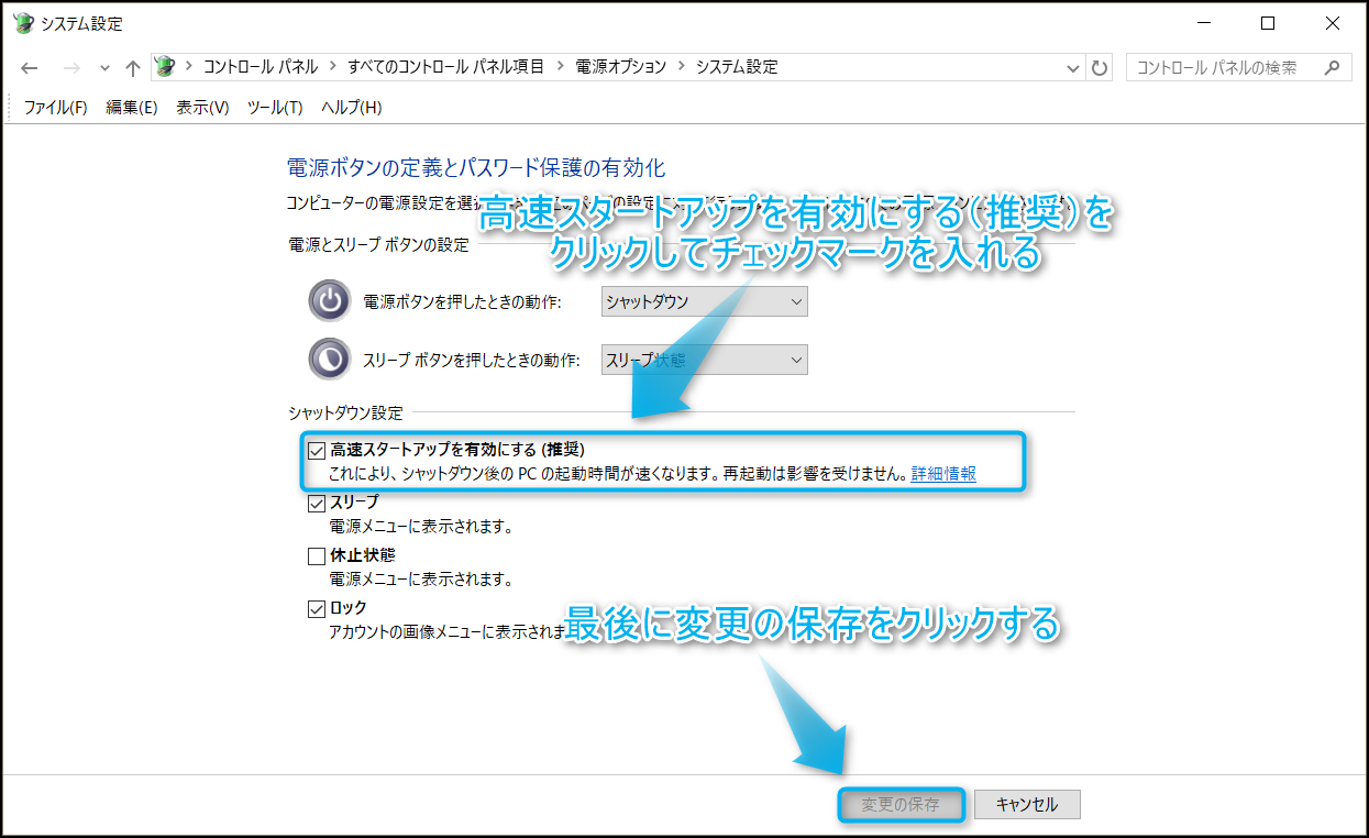 シャットダウン設定の項目にある『高速スタートアップを有効にする(推奨)』をクリックしてチェックマークを外したら『変更の保存』をクリックしよう。