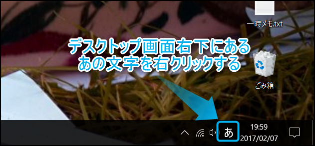 まずは、デスクトップ画面右下にある『あ』の文字の上で右クリックしよう。位置を変更していなければ、日付の左横に設置されていると思う。