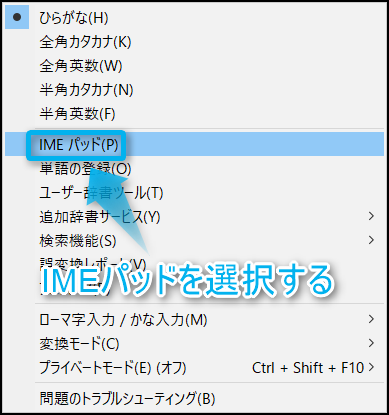 右クリックしてメニューを表示させたら『IMEパッド』を選択しよう。