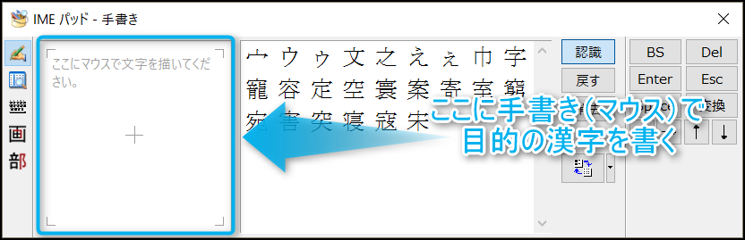 IMEパッドを表示させたら『ここにマウスで文字を描いてください。』の場所にマウスを使って目的の漢字を書いていこう。