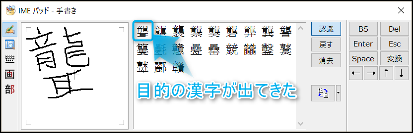 下手だけどなんとか頑張って書いてみた。そしたら右側に目的の漢字が出てきたね。こんなに下手でもしっかり読み取ってくれるらしい。