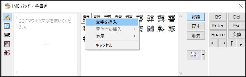 目的の漢字を入力するには、そのままクリックするか、右クリックから『文字を挿入』を選択すればOKだよ。