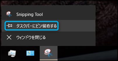 Snipping Toolを開いている状態で、タスクバーにあるSnipping Toolのアイコンを右クリックして『タスクバーにピン留めする』を選択しよう。