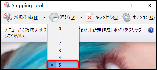 遅延をクリックして遅延させる秒数を指定する。今回は余裕を持って5を選択してみた。そして普通にキャプチャする時と同じように『新規作成』をクリックして、キャプチャしたい範囲をドラッグで選択する。