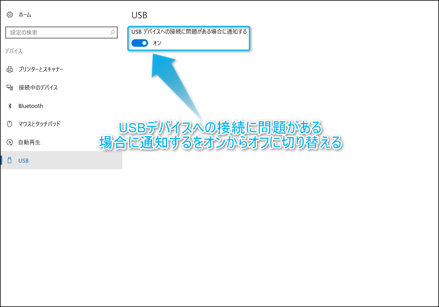 デバイスの画面を開いたら、左のメニューから『USB』を選択して『USBデバイスへの接続に問題がある場合に通知する』の項目をオンからオフに切り替えよう。