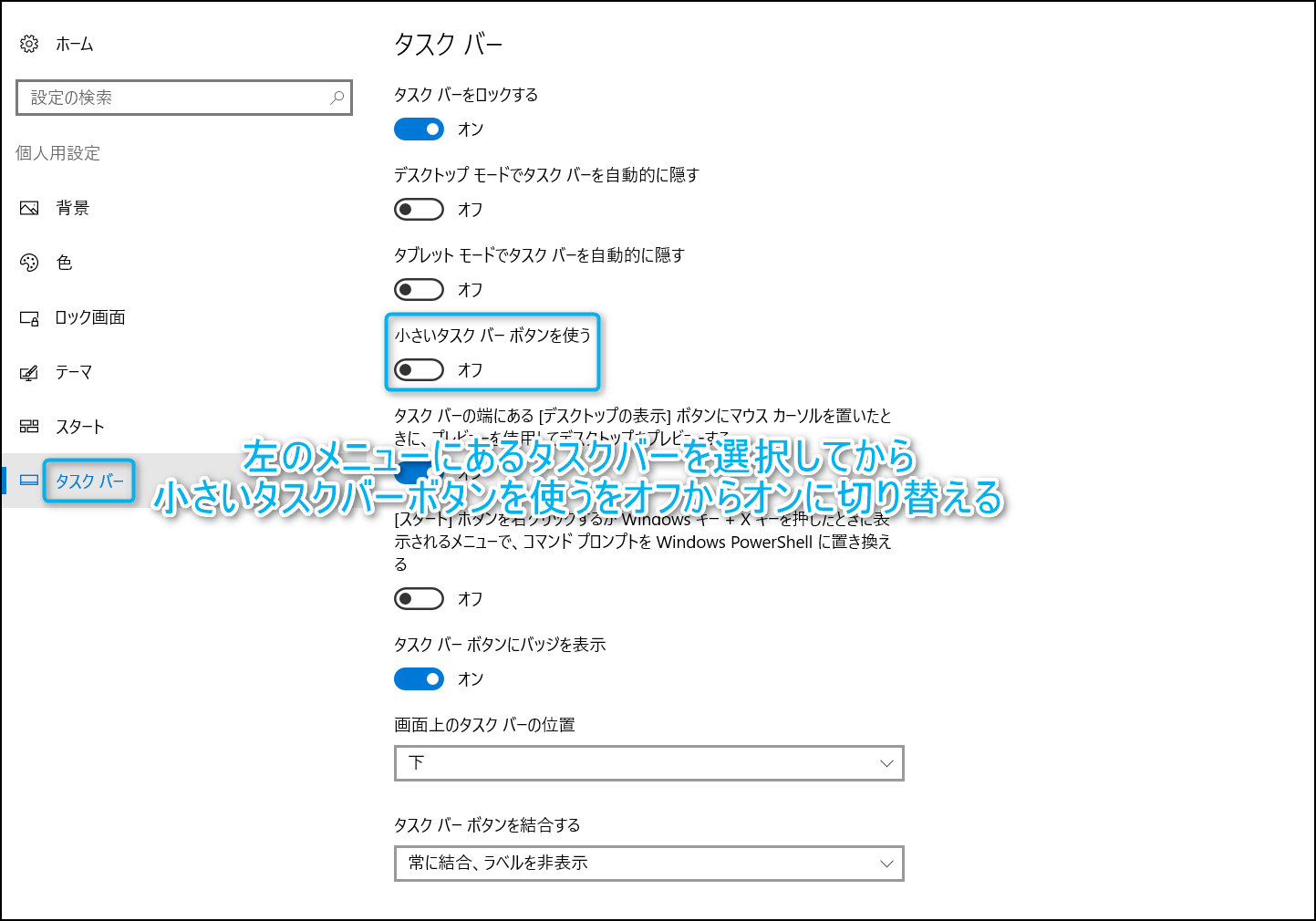 個人用設定の画面を表示させたら、左のメニューから『タスクバー』を選択してから『小さいタスクバーボタンを使う』をオフからオンに切り替えよう。これで小さいアイコンに切り替えることが出来たよ。