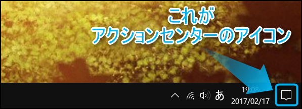 タスクバー右端に表示されている吹き出しのアイコン。これがアクションセンターのアイコン。メッセージの通知という意味でこのアイコンが使われているんだと思う。