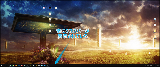 上の画像のように、Windows10をインストールして設定を何も弄っていなければ、タスクバーは常時表示されている状態になってるよね?タスクバーは使用頻度が凄く高いから、常に表示させている方が使いやすい。と判断したんだと思う。