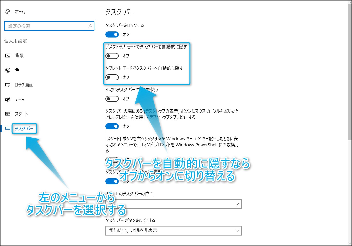 個人用設定の画面を開いたら、左のメニューから『タスクバー』を選択して『デスクトップモードでタスクバーを自動的に隠す』の項目をオフからオンに切り替えよう。