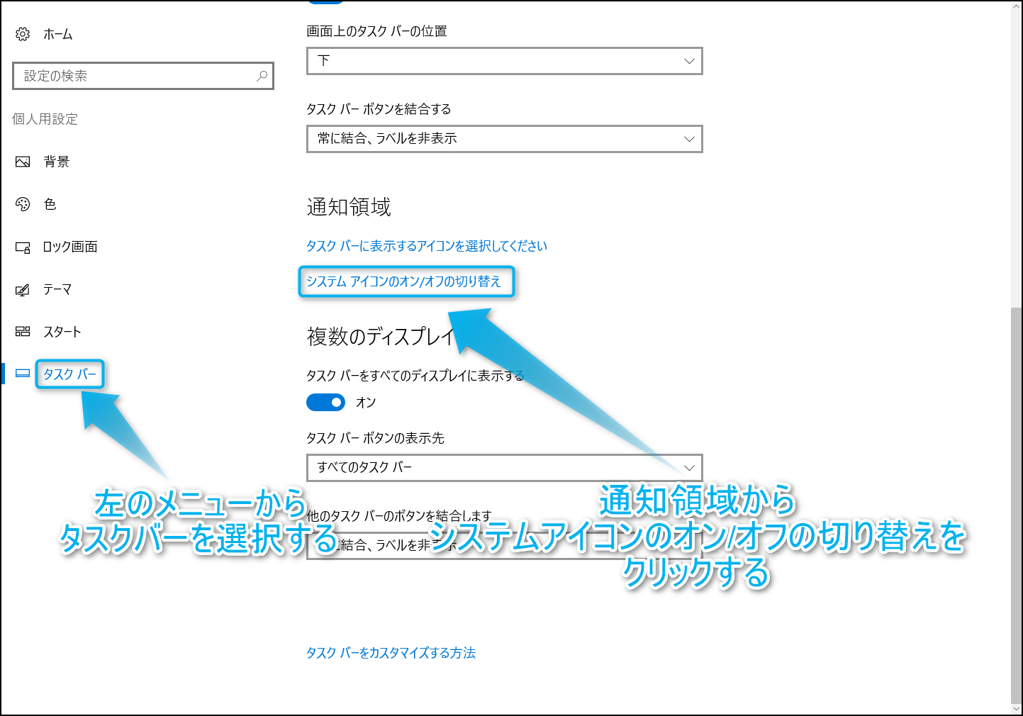個人用設定の画面を開いたら、左のメニューから『タスクバー』を選択して、通知領域の項目にある『システムアイコンのオン/オフの切り替え』をクリックしよう。
