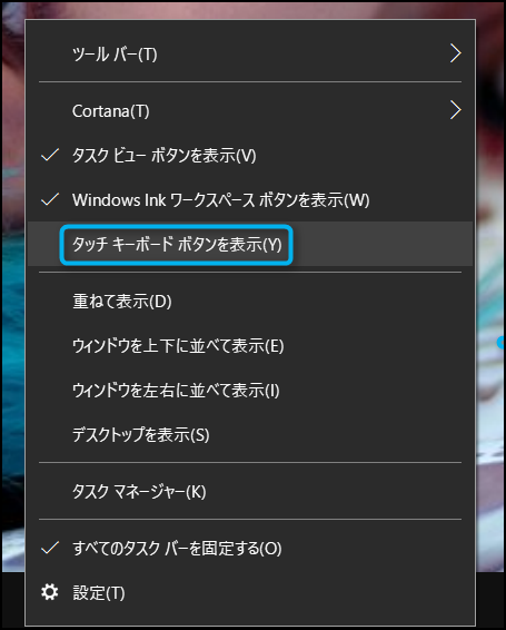 メニューを表示させたら『タッチキーボードボタンを表示』を選択して欲しい。この時に、タッチキーボードボタンを表示の先頭にチェックマークが付いていたら、既にタッチキーボードボタンが表示されていることになるよ。