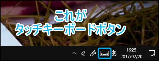 タッチキーボードボタンは、タスクバーの通知領域(右端)に表示される。