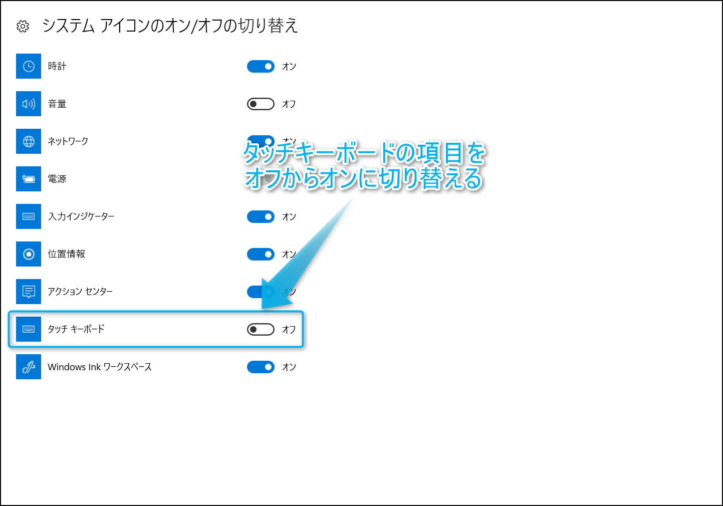 システムアイコンのオン/オフの切り替えの画面を開いたら、タッチキーボードの項目をオフからオンに切り替えて欲しい。