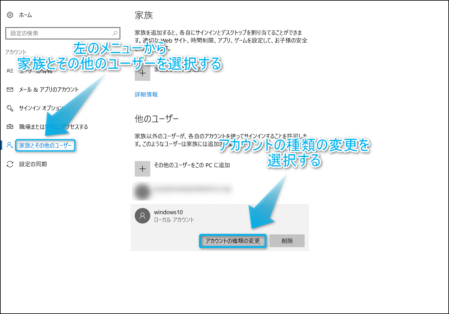 アカウントの画面を開いたら、左のメニューから『家族とその他のユーザー』を選択して、他のユーザーの項目から、種類を変更したいアカウントを選択しよう。選択したら『アカウントの種類の変更』をクリックしてね。