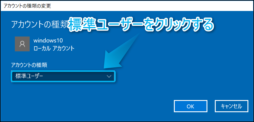 アカウントの種類の変更画面を開いたら、標準ユーザーの部分をクリックしよう。